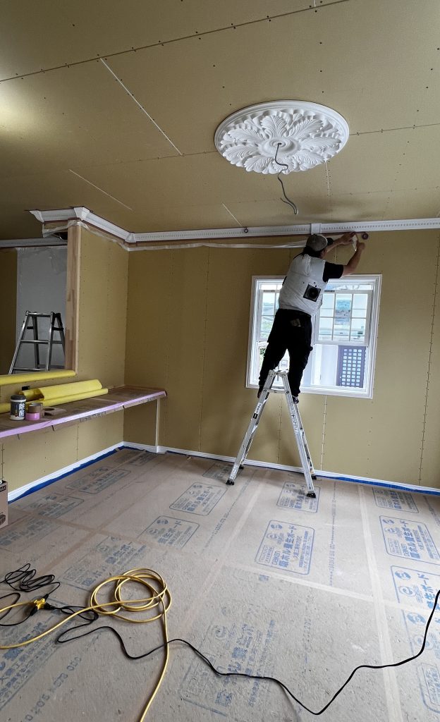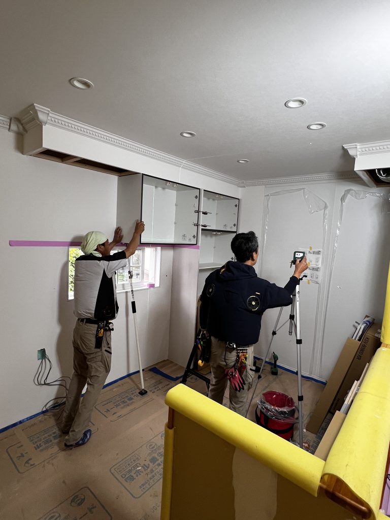 内部大工工事が終わると、一気にクロス貼り、設備器具設置、塗装、内部塗り壁など進みました